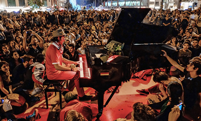Мужчина играет на пианино для протестующих на площади Таксим в Стамбуле.
